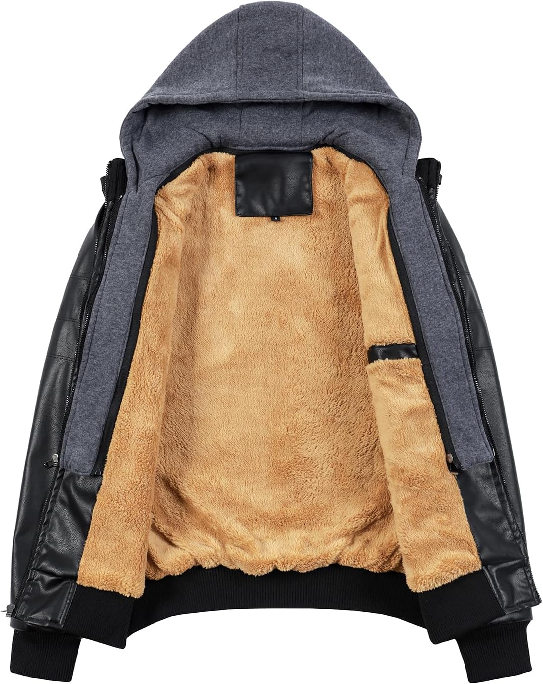 Men’s Warm Black Fleece PU Leather Motorcycle Jacket with Removable Hood
